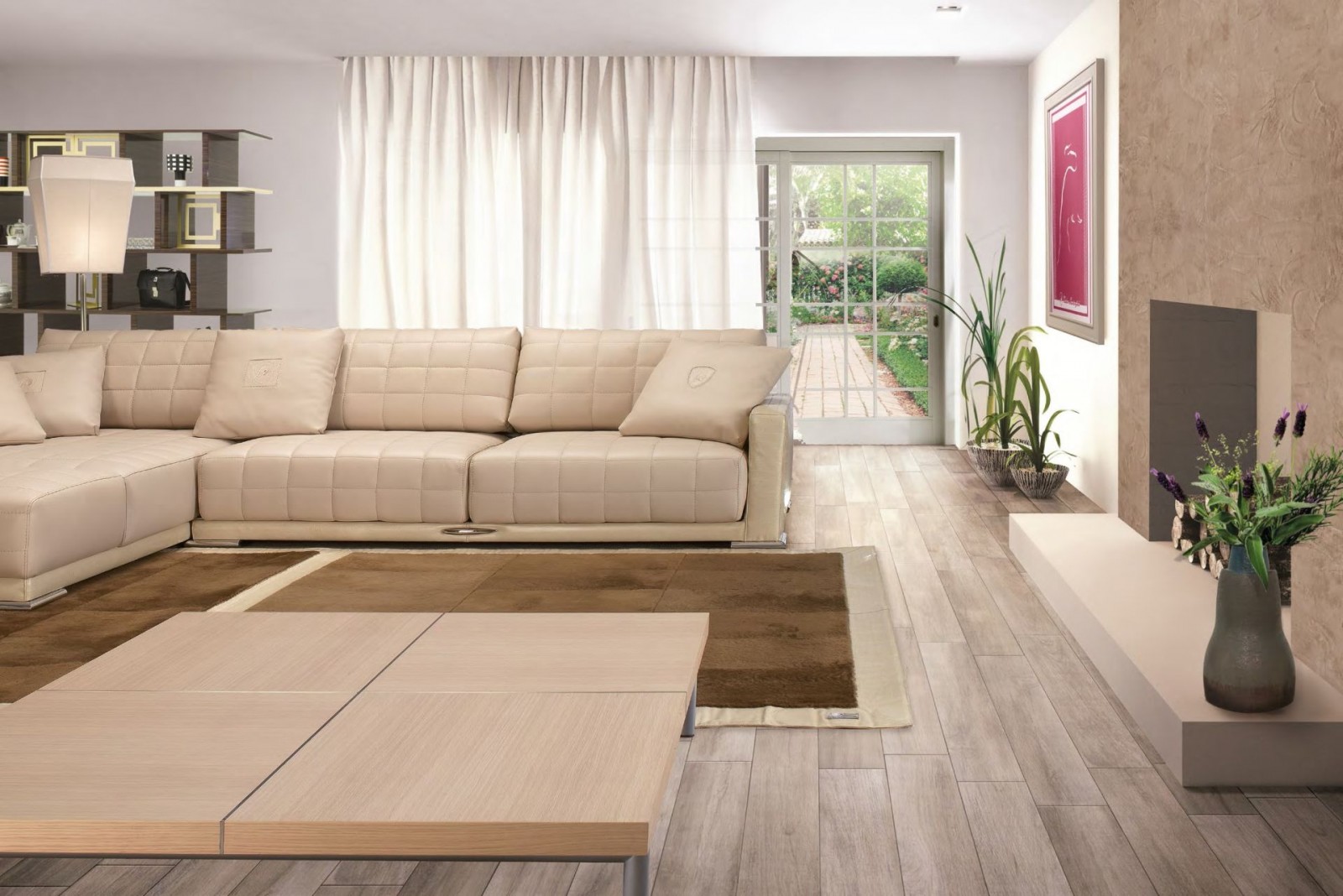Стеганый кожаный диван кремового оттенка - fmi/863